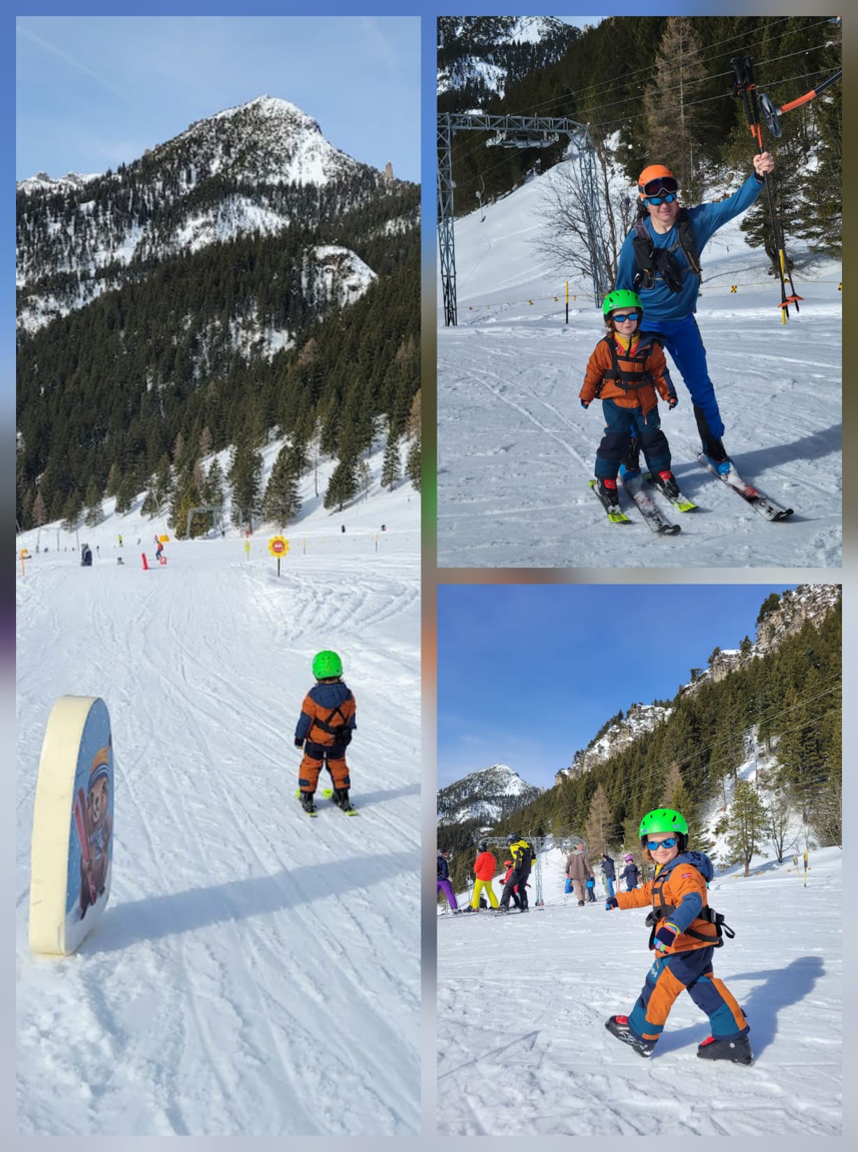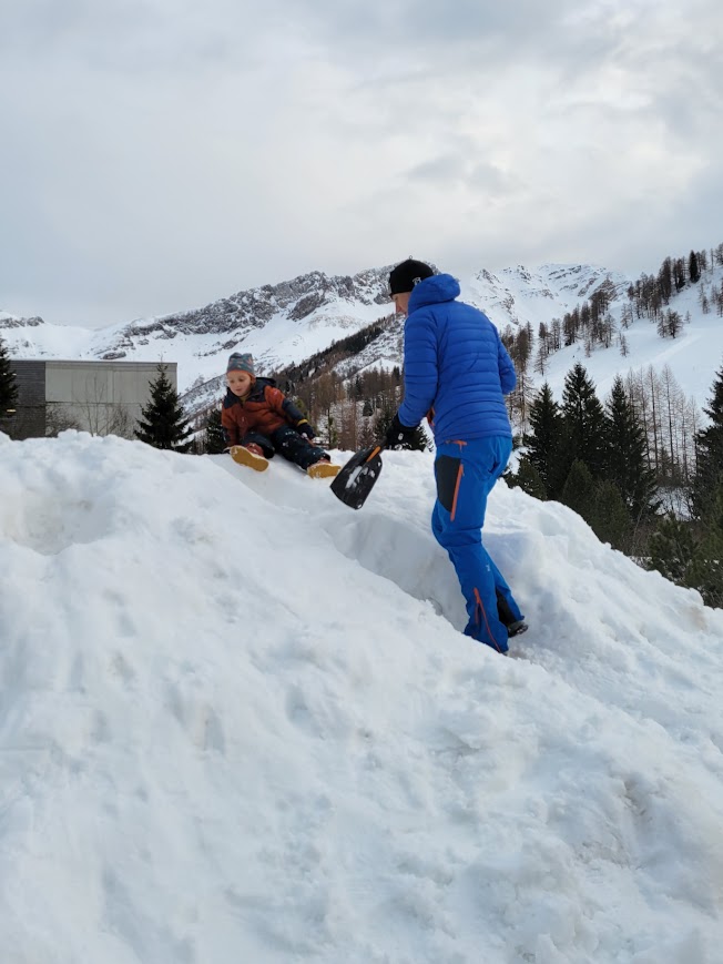 Rămân cu V la schi pe pârtiile mici cu tot felul de chestiuțe pentru copii. Un carusel, o gustare, de câteva ori pe skiliftul mic și pe covorul magic, apoi decidem să ne mutam baza la pârtia mai mare. Arăt interesant probabil cu un rucsac mare în cârcă, o sanie mare de lemn în mână și trăgându-l pe ghindoc de ham pe mica pantă spre cealalaltă pârtie. Dar cine mai e apoi ca noi, după ce urcăm, ne așezam pe “banca privată”, adica sania să ne relaxăm la soare și o gustare 🙂