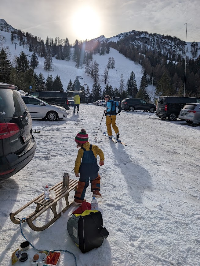 Retragerea la mașină. Băieții rămân în parcare să mănânce din desagă, iar eu o tulesc cu Dani la o urcare scurtă pe schiuri de tură și coborâre pe pârtia goală. O plăcere la urcare, coborârea însă e așa de grea cu clăparii ăstia flexibili…